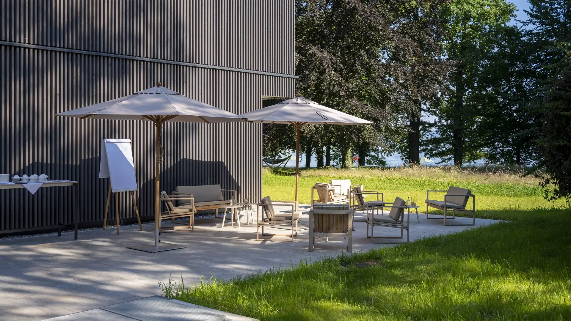 Ja. Terrassen und Parkflächen eignen sich für Breakouts und aktive Pausen; der Seezugang ist Teil des Geländes.